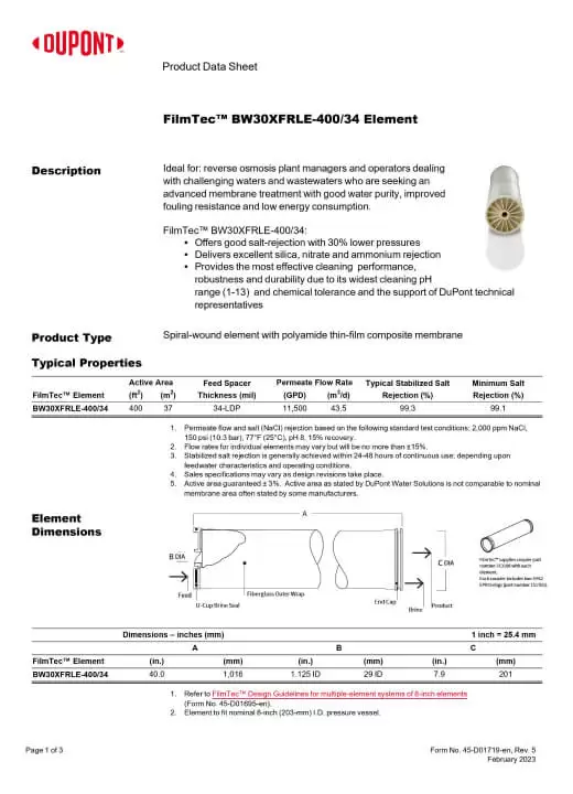 FilmTec BW30XFRLE-400/34 is ideal for reverse osmosis plant managers and operators dealing with challenging waters and wastewaters who are seeking an advanced membrane treatment with good water purity, improved fouling resistance and low energy consumption.